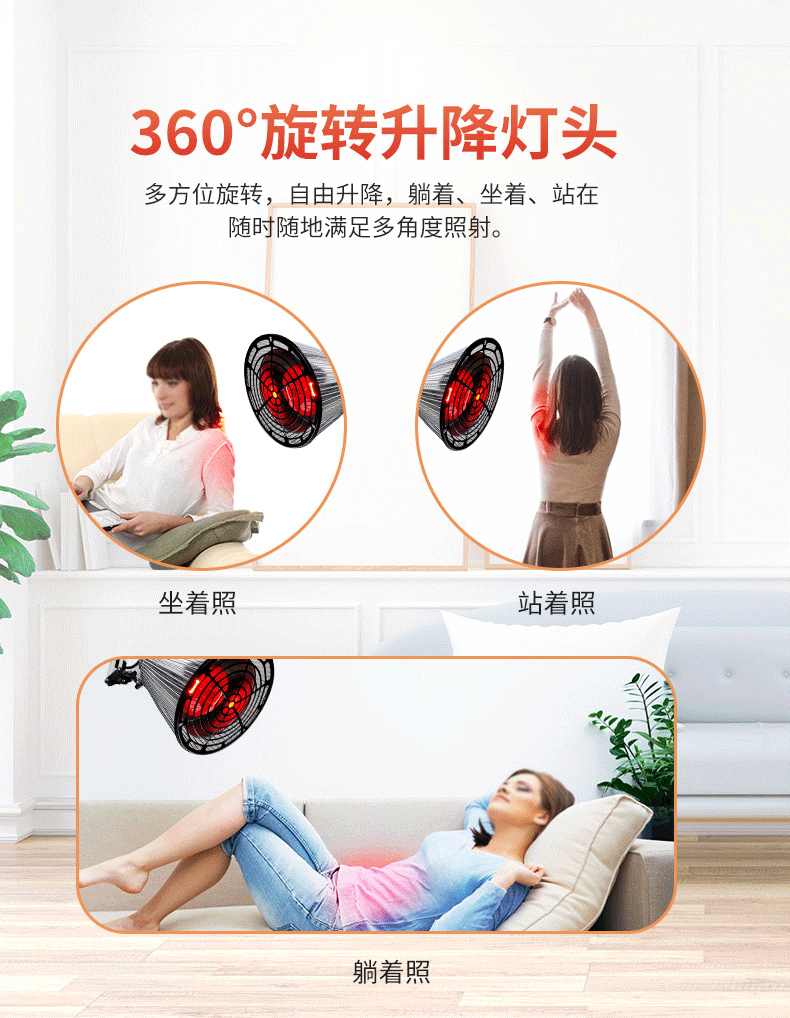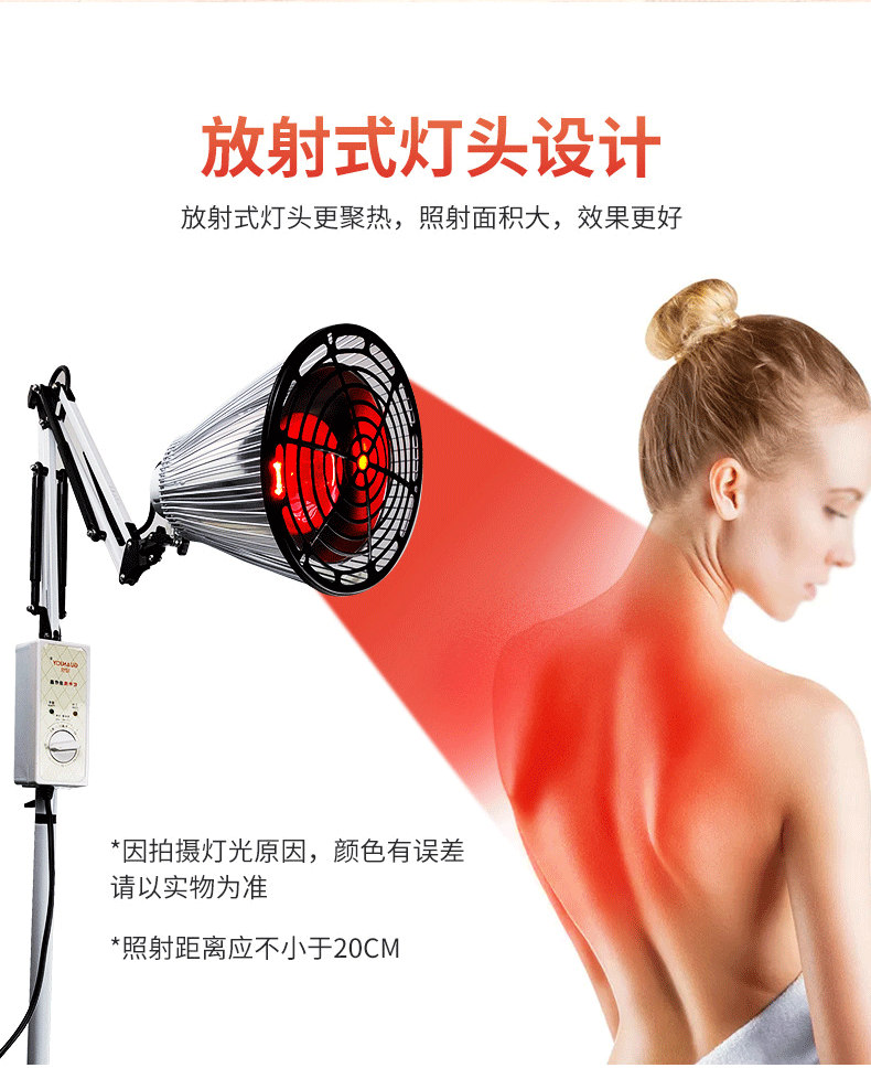 立式紅外線烤燈:360°旋轉(zhuǎn),多方位旋轉(zhuǎn),自由升降,可以滿足多角度照射,更加便捷自由。紅外線是一種電磁波,在所有太陽光中,最能深入皮膚和皮下組織,促進血液循環(huán),使身體保持一定的溫度,能迅速的被人體吸收;滲入人體的遠紅外線會引起原子和分子的振動,透過共鳴吸收,形成熱反映,促使皮下深層溫度上升,微細血管擴張促使血液循環(huán),將淤血等妨害新陳代謝的障礙清除干凈,重新使組織復活,促進生長。